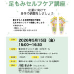 - 足もみセルフケア講座[外部団体主催イベント]※こちらのイベントは外部団体主催イベントです。お申込み・お問い合わせは主催団体「ウェルネット」へお願いいたしま… 続きを読む: 足もみセルフケア講座[外部団体主催イベント]