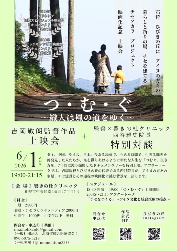 【北海道統合医療学会主催】「つ・む・ぐ~織人は風の道をゆく~」上映会+吉岡監督・西谷院長対談のお知らせ