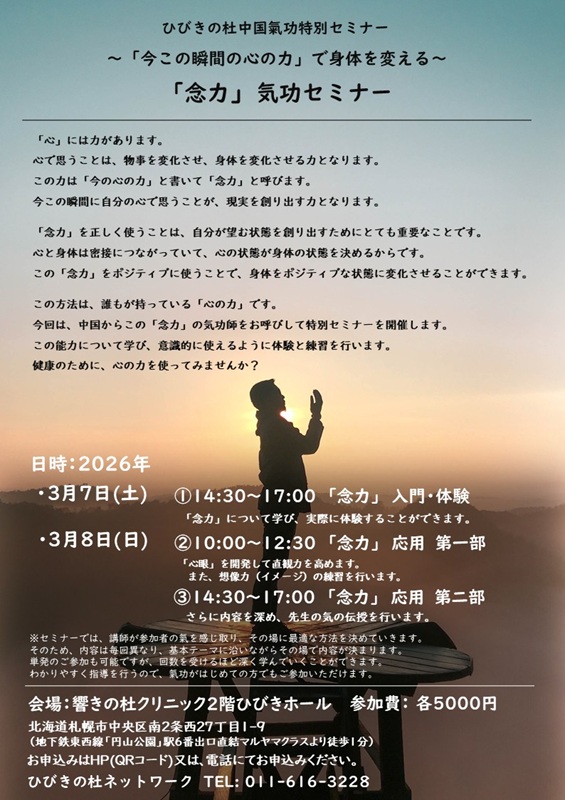 3/7(土)・8(日)「念力」中国気功セミナー ~今この瞬間の心の力で身体を変える~