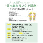 - 足もみセルフケア講座[外部団体主催イベント]※こちらのイベントは外部団体主催イベントです。お申込み・お問い合わせは主催団体「ウェルネット」へお願いいたします。 足もみセルフケア講座 〜冬に向けて冷え対策をしましょう〜 ◆イベント詳細 ”冷えは万… 続きを読む: 足もみセルフケア講座[外部団体主催イベント]