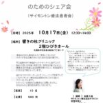 - 10/17(金)がん患者さんとご家族のためのシェア会(サイモントン療法)患者会はがん患者さんやご家族・ご友人などサポートする立場の方々のための交流の場です。同じ経験を持つ患者さんやサポーターと話すことで悩みや思いを共有・共感でき、気持ちが軽くなったり、療養生活を快適に送る… 続きを読む: 10/17(金)がん患者さんとご家族のためのシェア会(サイモントン療法)